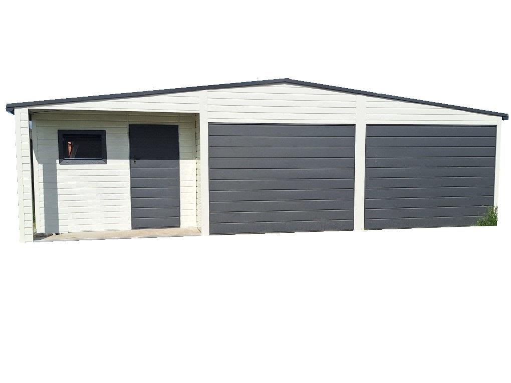 Garaż blaszany 8x6m z dwiema bramami uchylnymi – biały + antracyt